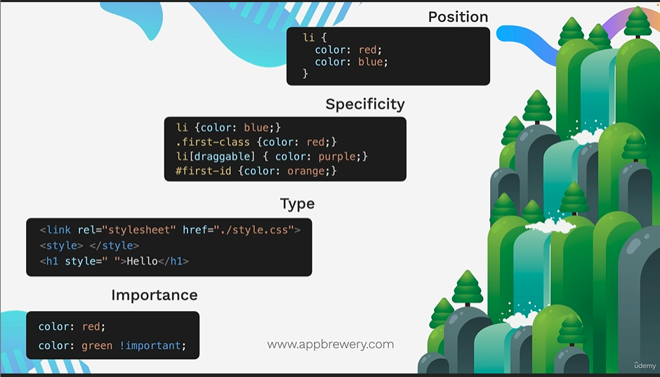 Imagine a waterfall, where water (styles) flows from top to bottom. At each level, the browser decides which style “wins” based on certain rules. This flow of determining which styles get applied is what makes CSS a cascading system.